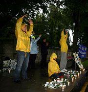 最后法轮功学员赵明表示:“今天天气一直都不好,一直都在下雨,但是我们的蜡烛并没有熄灭。在这八年迫害中,法轮大法也像这蜡烛一样,在风雨中没有灭,没有倒下。可是,中共邪党却在它发动的对‘真善忍’的迫害中在走向解体,走向灭亡。”