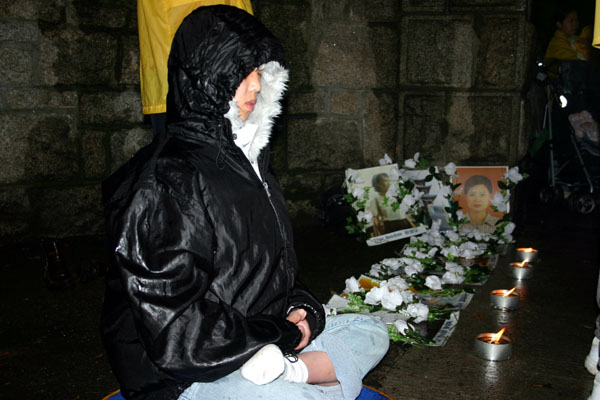 一位年轻的小伙子看到这样的天气下,法轮功学员依然静坐反迫害。感动的一定要拍照留念。
