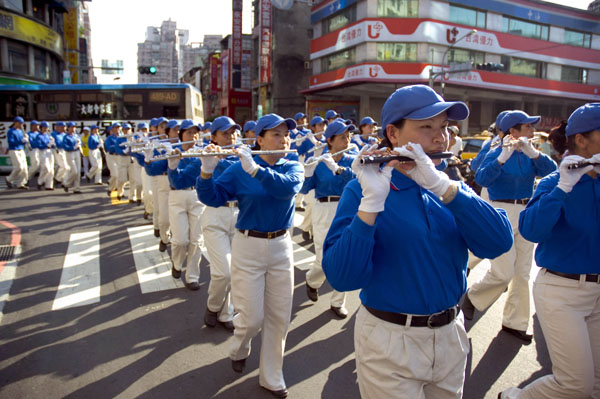 阵容庞大的天国乐团,吹奏着「法轮大法好」,吸引行经的路人、汽机车骑士驻足围观