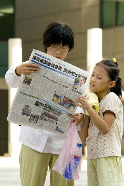 一位老伯很认真的看着法轮功真相材料。他说中共真是邪恶组织,为何要打压一个讲真相的团体?法轮功是很好的团体。现在没有人敢讲真话了,都在谎言下生活,只有法轮功敢讲。他也对炼功感兴趣,询问学员是否每天都要炼功。