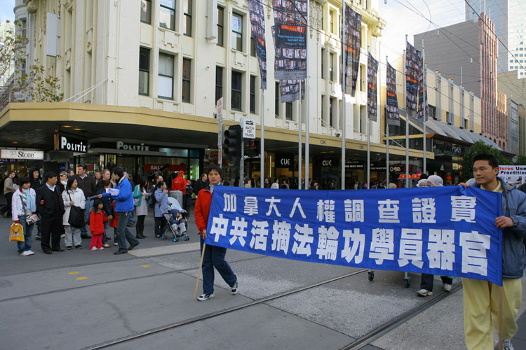 集会后,举行了反迫害游行,行人们对游行队伍展示的法轮功受迫害真相感到震惊,观看的非常仔细,纷纷接受真相传单,并询问详情。