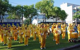 二零零七年七月二十一日黄昏,台湾嘉义县新港乡的铁路公园里,飘荡着阵阵铿锵有力的鼓声,这是由一群法轮功学员组织的腰鼓队,他们今天受到新港乡民邀请,到这里来表演腰鼓舞。
