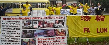 法轮功学员们在草坪上静坐抗议,打出“法轮大法”、“抗议中共活体强摘法轮功学员的器官牟利”等中法英三种文字的横幅,展示揭示法轮功学员被中共残酷迫害的图片和一些国际社会各方相关报道的展板等。法轮功学员谴责中共的残酷迫害,并悼念那些为坚定信仰“真、善、忍”而被中共迫害致死的中国大陆同修。