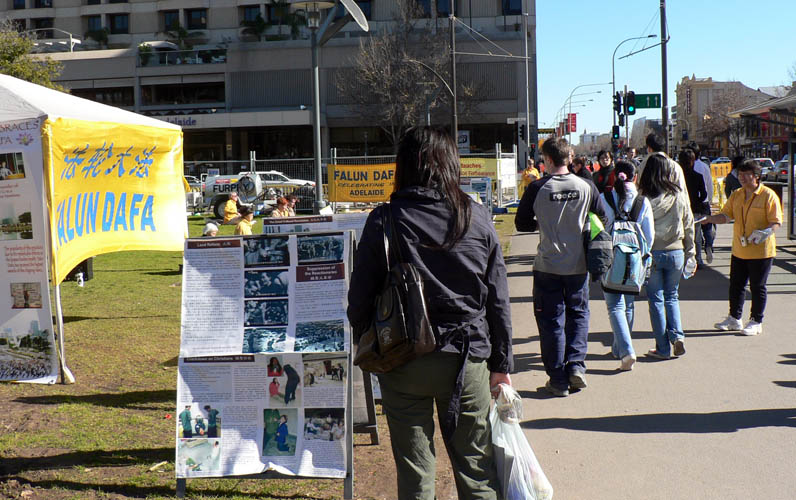 【明慧网二零零七年七月二十五日】澳洲南澳部份法轮功学员二零零七年七月二十一日在阿德莱得市中心维多利亚广场举行活动,呼吁所有善良人一起伸张正义,共同结束中共对法轮功的残酷迫害。他们打出:“法轮大法好”、“揭露中共活摘法轮功学员器官的暴行”、“声讨中共对法轮功的八年残酷迫害”、“声援两千四百万勇士退出中共”等横幅,引人注目。许多人驻足了解详情。