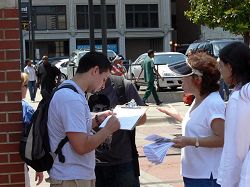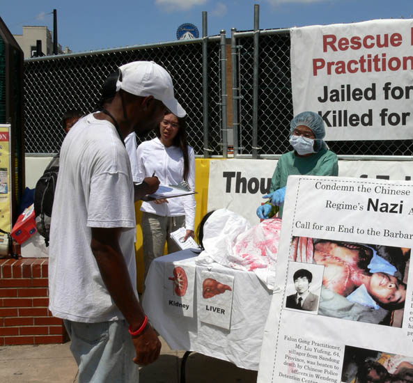 过往行人了解法轮功在中国遭受迫害的情况