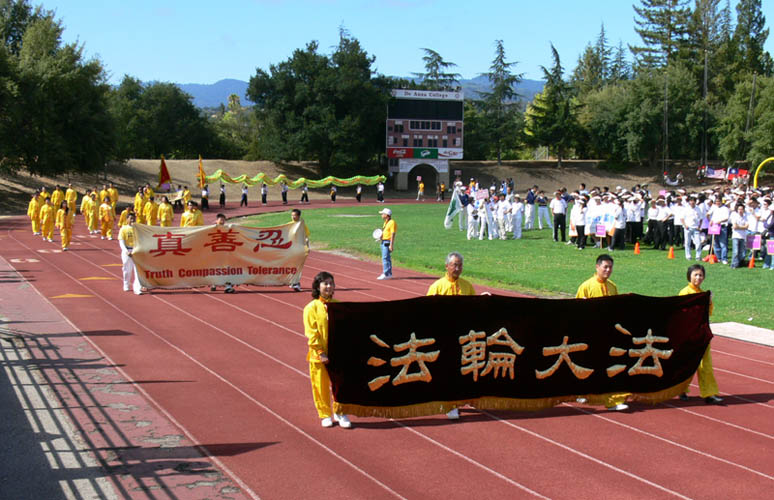 【明慧网二零零七年七月二十六日】二零零七年七月二十二日,第二十三届「金山湾区华人运动大会」在美国加州南湾库泊蒂诺市(Cupertino City)迪安萨学院(De Anza College)举行。今年有近百支队伍参加开幕入列式,法轮功学员也应邀出席。