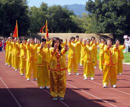 四十位法轮功学员在开幕入列式中展示了法轮功功法。当队伍接近主席台时,一位女士高兴的跑到台前高喊着“法轮功”,并鼓掌以示欢迎。