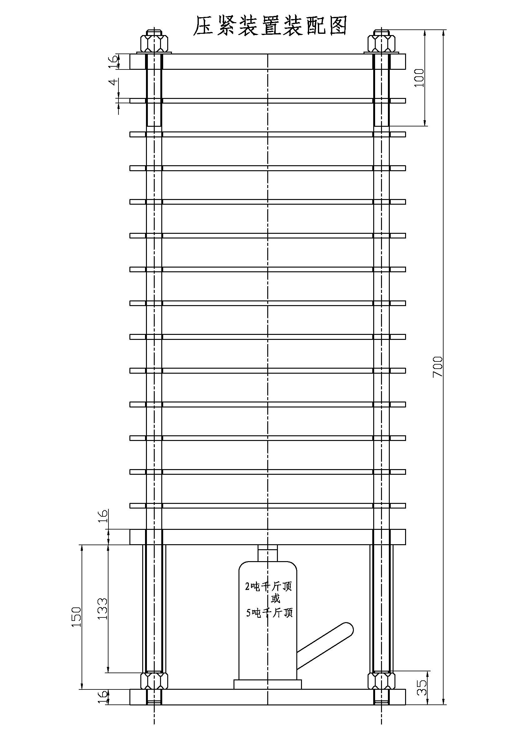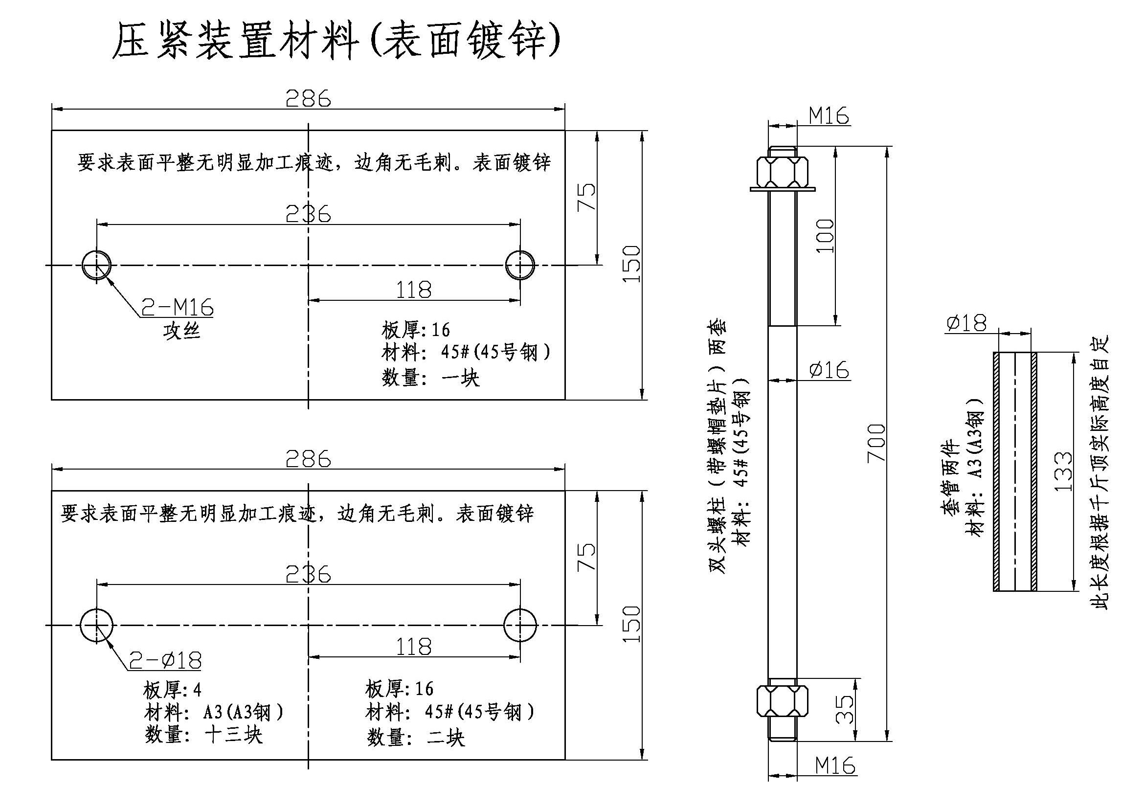 先按“压紧装置材料图”把所需材料备齐(在当地钢材市场)并按图加工好,再拿去电镀锌,再买一个两吨或五吨千斤顶(30-50元)。