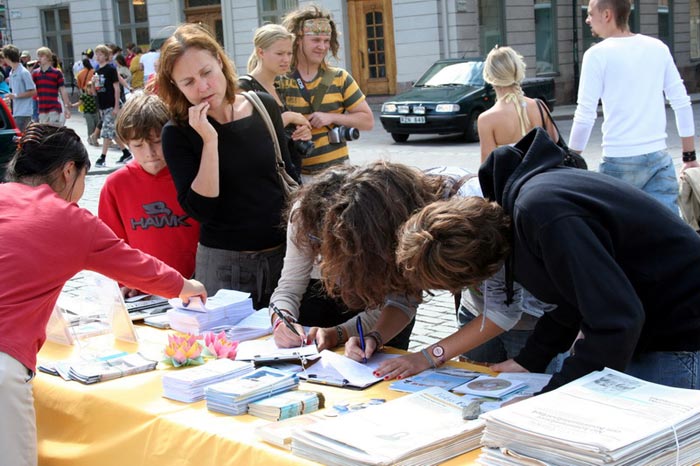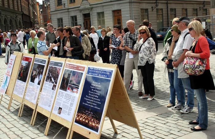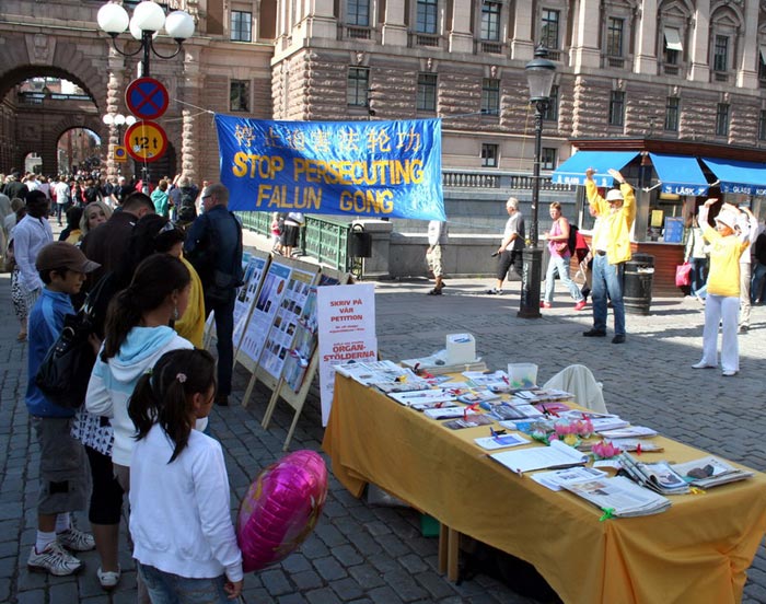 七月二十八日至二十九日,法轮功学员借世界帆船比赛这个机会在斯德哥尔摩市中心广场上挂起“停止迫害法轮功”的横幅,摆放介绍大法洪传世界和法轮功学员在中国无辜遭受中共迫害的展板,向来自世界各地的游客发放不同语种的真相资料,同时演示五套功法。优美的音乐、舒缓祥和的功法演示吸引了众多游客,人们驻足观看并询问更多的信息。法轮功学员耐心的与人们交谈,从中共对法轮功的迫害,讲到中共劳教所内活体摘取法轮功学员人体器官的黑幕;从中共的邪恶本质,讲到善良的人们呼吁制止这场迫害的必要。人们纷纷签名,谴责中共的恶行。一位男士对法轮功学员说:“活体摘取人体器官,这样残暴的事情中共能干的出来的,这是它的本质决定的。你们做的对!就是要让更多的人认清中共的邪恶本质,我支持你们!”