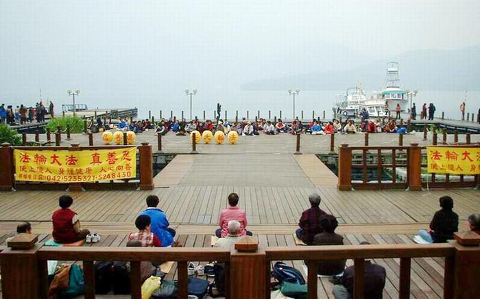![]() 日月潭水社码头,法轮功学员集体炼功 |