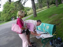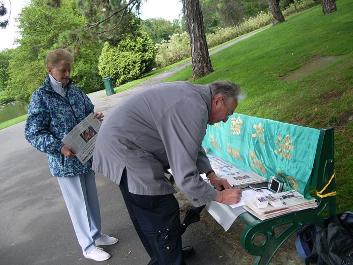 二零零七年七月二十九日,是我炼功开始的第一天。下午我带着大法横幅和自制的介绍大法的展板还有一些真相报纸,来到公园。炼功刚开始一会,法轮大法的美好、祥和就吸引了不少有缘人前来。人们在了解了迫害真相后都纷纷签名支持反迫害。