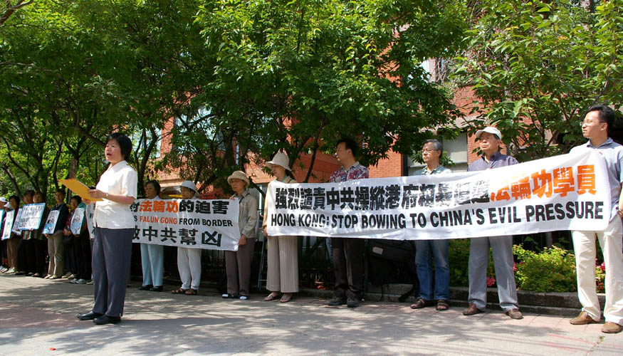 【明慧网二零零七年七月五日】(明慧记者叶灵辉报道)二零零七年七月三日,法轮功学员及支持者在香港驻多伦多经济贸易办事处外,抗议香港当局依照中共黑名单,非法阻止持合法签证的台湾法轮功学员入境香港,并暴力遣返。