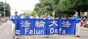 法轮功队伍的方阵是:横幅队、天国乐团、以及花车。法轮功队伍出场了,观众们看到法轮功学员精神焕发,手持“法轮大法-真、善、忍”的横幅在前开道;天国乐团学员昂首挺胸,击鼓吹号展雄姿,演奏了“法轮大法好”、“美丽的美利坚”等乐曲;花车上学员在展示优美、缓、慢、圆的功法。这壮观、美好、风格独特的法轮功队伍使观看的市民震撼,被深深的吸引着。市民专注的观看着,那样的宁静,仿佛时间停滞了,当法轮功队伍快走过他们眼前时,突然才想起鼓掌。