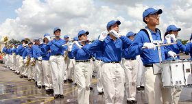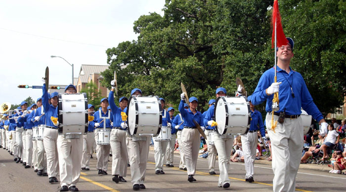 由德州休士顿市(Houston)、达拉斯市(Dallas)、奥斯汀市(Austin)和圣安东尼市(San Antonio)的法轮功学员组成的天国乐团首次亮相于大游行队伍之中,学员神采奕奕,身着蓝衣蓝帽白裤白手套,肩跨白鼓,手持金光闪亮的各种铜管乐器,令市民惊喜,耳目一新。法轮功游行队伍还包括花车上身着金黄色炼功服的学员,祥和清新,引人注目。第二次参加该游行的法轮功队伍是其中唯一以华裔为主的团体。