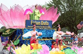 ![]() 精美的花车撒播着法轮大法的福音 |