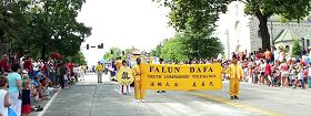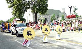 参加游行的团体很多,法轮功学员的花车排在后面。天籁般美妙的“普度”音乐、醒目的横幅和“真、善、忍”牌匾、祥和优美的功法演示,让人们在游行队伍的最后发现了惊喜。路旁的人们,不论男女老少,都目不转睛的看着。有不少人赞叹道,“Awesome!” (太棒了!)“Pretty!”(很美!)“Very Nice!”(很好!)“Thank you!”(谢谢!)有的观众情不自禁的模仿起花车上学员的炼功动作,有的合十向法轮功学员致意。