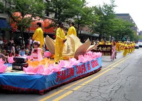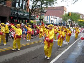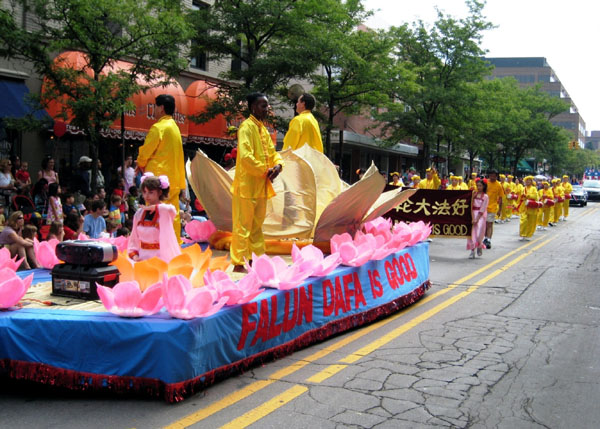 法轮功学员的队伍由花车和腰鼓队组成。以金黄为主色调的队伍对于郁郁葱葱的安娜堡来说,真是锦上添花。用大小各色莲花装扮一新的花车上,一位西人学员身着美丽的仙女服盘坐在粉红色的莲花座上炼法轮功第五套功法,宛若仙女下凡。花车上另有三位学员身着金黄色炼功服,其中一位站在巨大的金色莲花中,伴随着悦耳的炼功音乐向观众演示法轮功各套功法。美丽的花车和学员们优雅舒缓的动作,深深的吸引了街道两旁的观众。花车后面是步伐整齐的腰鼓队。在嘹亮的“法轮大法好”的歌声中,腰鼓队精神焕发,鼓声咚咚有力。在腰鼓队员们向两旁观众挥手致意时,观众总是报以热烈的掌声。