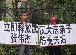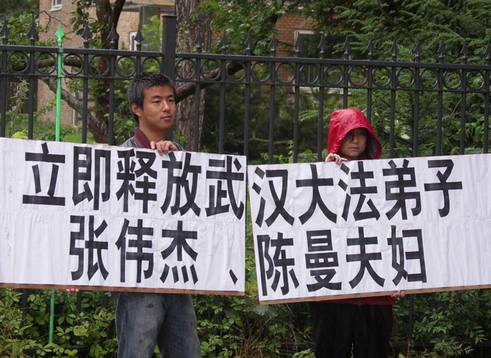 丹麦学员中使馆前抗议恶党绑架武汉大法弟子(图)