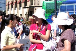 退党服务中心的姜女士说:今天我两点左右到现场,碰到几位中国人,当我给他们递“九评”、讲当前的退党大潮时,他们都接了“九评”并驻足静听,其中三位接受了劝退,由我帮他们在大纪元网站声明退出中共团、队组织,同时他们都接受了法轮功的真相小册子。真的感到越来越多的中国人在找真相了。