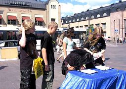 活动中几位日本人、芬兰人和操英语的西方人都提出了一个相同的问题:为什么共产党不喜欢法轮功?义工和学员解释,信奉“假恶暴”的中共恐惧越来越多的人去信“真善忍”,它就无法再操控人们的思想了。义工和学员还推荐人们去阅读《九评共产党》,去了解共产党的邪恶本质,就会从根本上回答疑问。当向他们递上英文“九评”时,每个人都诚恳的道谢,如获至宝。