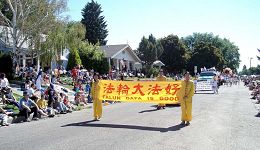早上十点,游行正式开始,“法轮大法”旗帜、横幅与坐在莲花中的仙女伴随着祥和慈悲的音乐在热闹的游行队伍中显的格外与众不同,几乎每到一处,欢呼声、喝彩声不断。许多群众热情的高喊“Falun Dafa”,还有许多小孩子指着坐在莲花中的法轮功女学员叫到“Chinese princess(中国公主)”。