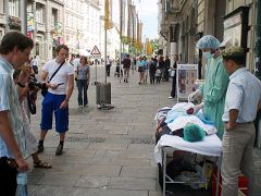 六月二十三日当天,格拉茨市区由于举办一个大型活动,大街小巷人潮汹涌。许多人驻足在法轮功学员的信息台前,对法轮功学员为揭露中共暴行進行的真人模拟活摘器官演示震惊不已。学员向众人讲述中共的血腥暴行,许多人签名呼吁制止中共活摘法轮功学员器官以及对法轮功的迫害。