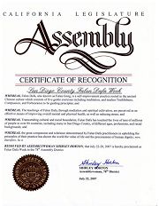 【明慧网二零零七年八月一日】截至二零零七年七月,中共政权悍然发动的对法轮大法的迫害已达八年之久。为了向社会广泛讲清真相,美国圣地亚哥法轮功学员将七月二十二日至二十八日定为「圣地亚哥法轮大法周」,并举行一系列洪法和讲清真相的活动。多位美国国会议员和政府官员为大法周颁发嘉奖令(Certificate of Recognition)或者发来贺信。