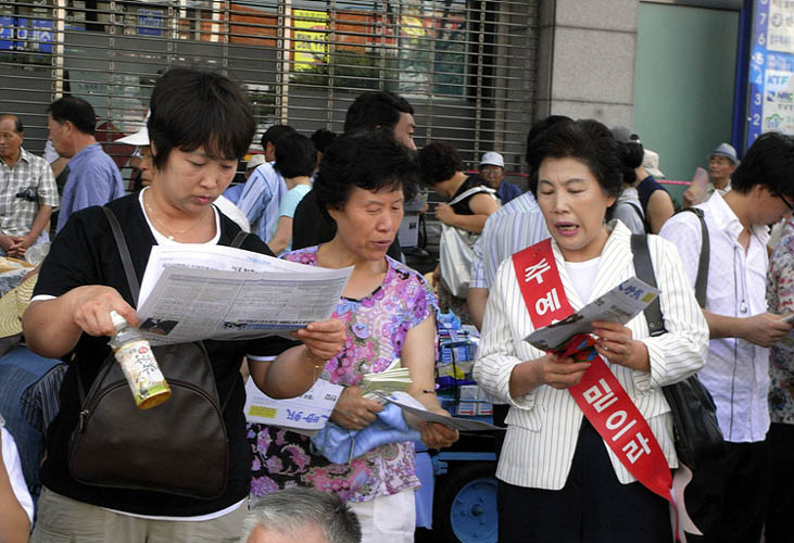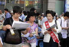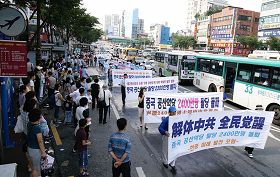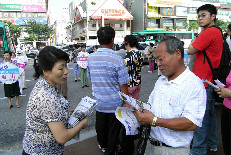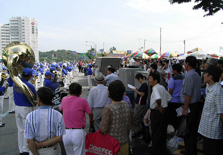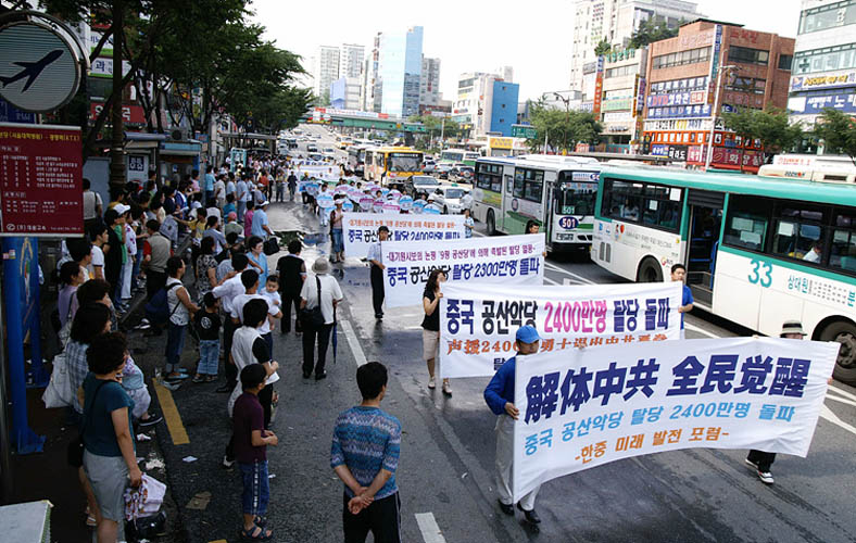 【明慧网二零零七年八月一日】二零零七年七月二十九日下午,也是全球退党月的最后一个周日,由二百多名韩国法轮功学员组成的队伍,顶着似火的骄阳,在首都首尔著名的“五日场”─木兰市场边游行,将二千四百万人退出中共邪党组织的消息,告诉前来集市的十万民众,其中包括中国人。许多人纷纷聚集观看游行,有的表示声援。
