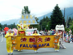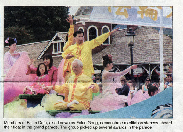 ![]() “斯诺阔米山谷报”刊登了法轮功学员的花车在游行中的照片 |