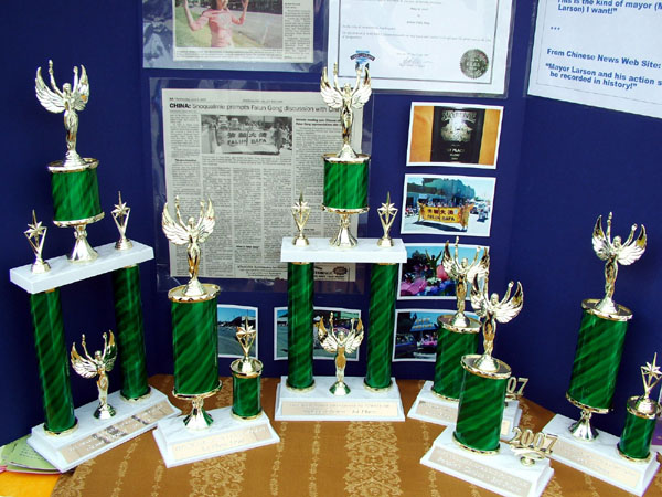 游行过后,人们簇拥到法轮功学员的摊位,询问何处学功,了解真相,索要纸叠莲花,赞赏学员的游行表演。主办单位人士捧着六个奖杯来到法轮功学员的摊位前说,“这些都是你们的!没人比得上你们!”
