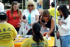 也有不少人想进一步了解中共对中国人民的迫害史。有一对夫妇带着孩子来到摊位前,说他们在报纸上看到对法轮功的报导,希望得到更多学习法轮功的资料,并深入认识中共的历史。那位男士表示他是历史系毕业的,对此非常有兴趣。交谈后,他们满意的带着《九评共产党》的DVD离去。一家从大陆来的人,年老的母亲曾经在大陆学过法轮功,迫害开始后就不敢炼了。此次女儿带着母亲来,希望母亲能重新再学法轮功,而她自己在听学员讲真相后,声明要退团、退队。