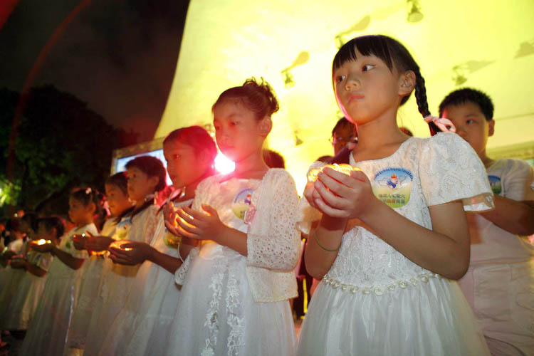 响应八月九日人权圣火在雅典点燃,台北于十日晚间举行「人权圣火之夜」,呼吁人们共同努力,早日终止中共的迫害。(图为来宾与三十二位儿童共同传递烛光,代表人权圣火的光明到来)