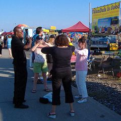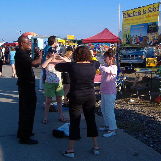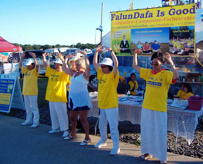 活动的第二第三天,晴空万里。学员们的功法演示、腰鼓舞、图片横幅及音乐吸引了许多游人。人们拿了资料并认真的看起来;有许多人要了解法轮大法并要学功;也有不少人问了问题并要读《转法轮》;很多居民当听到“真善忍”三个字时马上表示:“这就是我需要的”;有的人跟着唱“法轮大法好”;有不少电视台、电台的摄影工作人员对学员们的功法演示和腰鼓舞做了录像及拍了照;有的马上要学功。从那期盼的目光中,学员们感觉到人们都在等待着了解法轮大法。