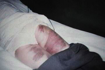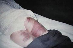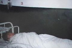 二零零一年,河北省秦皇岛市青龙县大法弟子朱秀平因喊“法轮大法好”,被青龙县看守所所长王金用铁锹暴打八十多下,锹把子都打断了,朱秀平的下肢被打得不会动弹。这是朱秀平被王金毒打半个月后在医院中的照片。