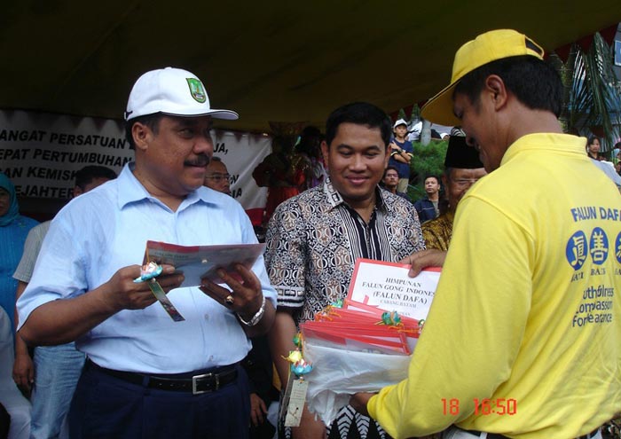 市长(左)接受法轮功真相资料