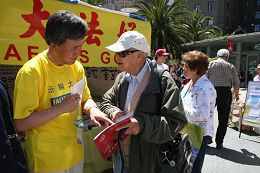 来自大陆的朱先生以前由于受中共的诬蔑宣传,对法轮功存在误解。今天他看到天国乐团的游行队伍,被天国乐团的演奏所感动。不由的对法轮功学员说,你们天国乐团真伟大,了不起!