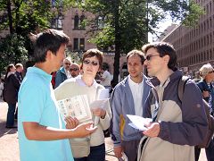【明慧网二零零七年八月二十一日】芬兰部份法轮功学员和退党服务中心的义工二零零七年八月十八日在赫尔辛基市中心的海滨大道公园(Esplanade Park)向芬兰民众和来自世界各地的游客揭露中共的邪恶本质,抗议八年来对法轮功学员灭绝人性的迫害;同时呼吁人们声援二千五百万中国民众退出中共组织(党、团、队)。