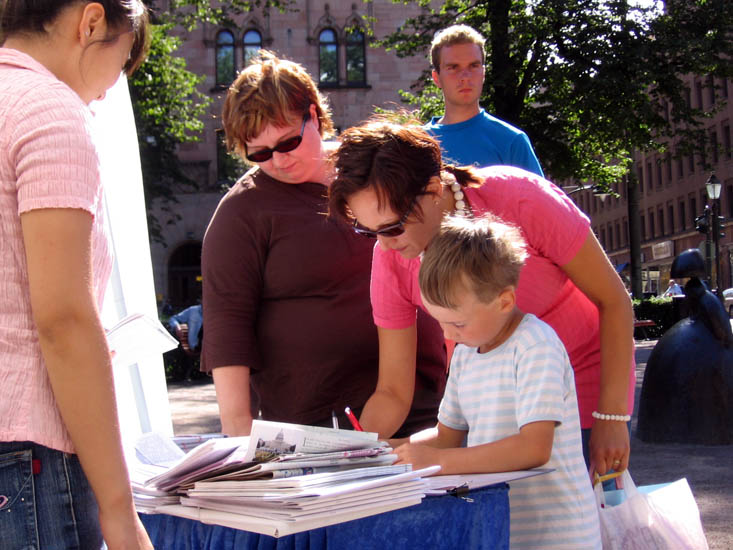 旅游旺季的夏日芬兰,各国游客川流不息。上午十点义工和学员刚来到公园布置展示现场的横幅、展板、和征签台,就看到络绎不绝的游客走过,忽听一位拎着行李的女士说:“法轮功,法轮功!”只见她直奔征签台,拿起笔就签名,学员问她从哪里来?她说:“瑞典”。