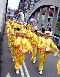 整齐耀眼的腰鼓队经过三峡拱桥街道,法鼓声声传递“真善忍”。