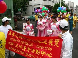 揭幕典礼结束后,随即有腰鼓队和仙女们的游街活动,一路上腰鼓队精神抖擞的表演着“法轮大法好”、“喜庆”、“古乐神威”等乐曲,仙女们分送路人美展的资讯和精美的小莲花。路人都很感兴趣,频频询问美展的讯息,也表示这么好的国际性美展能在民风纯朴的小镇上举行很难得。