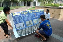 参加集会人士举着横幅和标语牌,其中有“不要中共恶党”、“广传九评,声援二千五百万退党”、“中共正在解体,你准备好了吗?”、“中共:停止活摘法轮功学员器官”等,还有很多图片真实的记录了中共恶党对中国民众的屠杀和迫害。