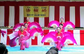 学员们为观众演示了法轮功的五套功法、传统的中国民族舞蹈扇子舞、表现纯洁而宁静的修炼境界的古典舞蹈“花仙”,表现神佛的慈悲和庄严的古典舞蹈“金光千手佛”,以及歌曲“法轮大法到人间”。