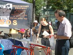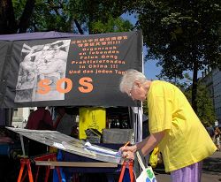 学员自制的签名台是一块小小的展板,上面讲述了法轮功学员受到中共迫害的真相,人们纷纷签名制止中共迫害
