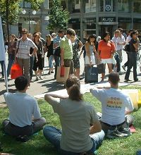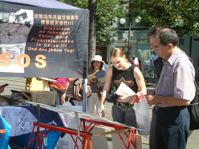 【明慧网二零零七年八月二十七日】(明慧记者杨思源瑞士报道)二零零七年八月二十五日,瑞士法轮功学员再次来到苏黎世(Zurich)著名的购物大街——班霍夫大街(Bahnhofstrasse),设立信息摊位,向路人讲述法轮功学员八年多来遭到中共残酷迫害的真相。
