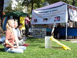 弗扬(Forian)和朋友一起仔细阅读了铺在地上关于法轮功学员八年多来受迫害的照片和说明,并在签名表上签名,要制止这场迫害。在高中时期,弗扬曾在关于中国的讨论课上了解过关于法轮功以及迫害的情况。他认为:“法轮功好,我认为人们可以通过做这样的事情(炼法轮功)平和的生活,对精神上也有帮助,这很好。” (录音(174KB)