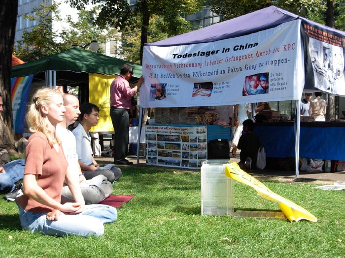 特别在签名台上方的黑色横幅上画着法轮功学员被活摘器官的惨烈场面。除了SOS的红色大字外,还用德语写道:“法轮功学员在中国被活体摘取器官!法轮功学员被活摘器官后被焚尸灭迹!”