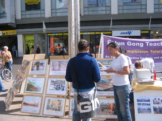 真相展板吸引了许多路人,他们停下匆忙的脚步认真的观看图片,并主动索取传单。绝大多数的人都曾听说过法轮功,但并不了解法轮功为什么被中共迫害。学员详细解释中共的邪恶本质和其在统治中国五十多年里对民众的残害。这样一个崇尚“假恶斗”的邪党无法容忍大批民众修炼“真、善、忍”法轮大法,于是发动迫害,企图使修炼者放弃信仰。听到这些,人们纷纷表示:“仅仅是因为炼功及对真、善、忍的信仰,就遭受这样残酷的迫害,实在是太不可思议了。”有些民众更提出应该要立即制止迫害法轮功,否则不应该让北京主办二零零八年奥运。