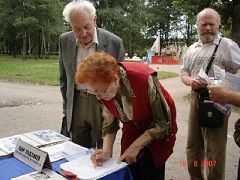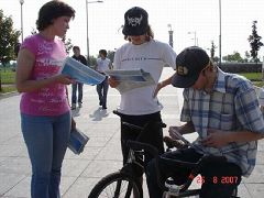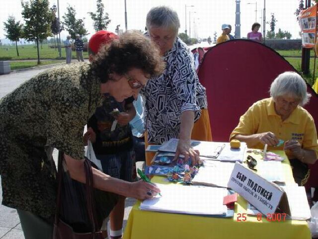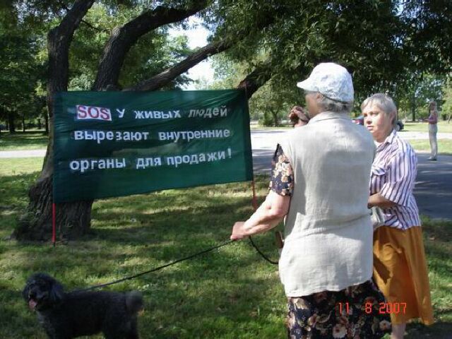 八月十一日,法轮功学员在阿维尔托罗夫(aviatorov)公园,以模拟演示的方式,揭露中共活摘法轮功学员器官牟利的罪行。一位在二战时曾被关進过纳粹集中营的老年妇女说,在集中营里发生过一些囚徒的金牙被强行摘取的事情,但简直不敢想象今天在中国竟然发生活体摘取器官牟利的事情,中共比法西斯还残暴。一些人对学员说:敢于向社会公开揭露中共这么凶残的犯罪集团,你们真了不起!
