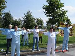 一部份学员向人们展示优美的法轮功功法,还有学员向人们发真相资料。一位学员的小孙子也跟着奶奶来讲真相,他专门叠了一个大大的莲花放在了“世界需要真善忍”横幅的前面。