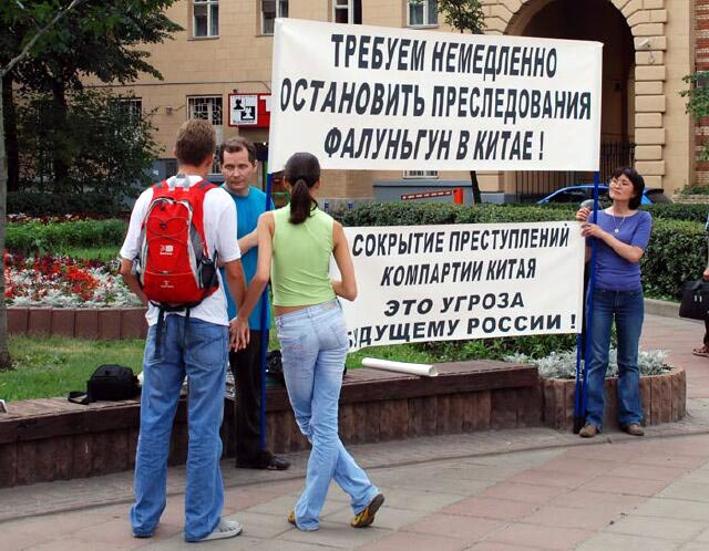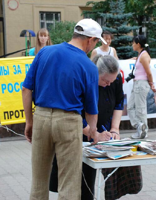 法轮功学员打出的横幅吸引了很多从附近地铁站出来的行人,他们中有国家杜马(议会)的工作人员,有俄罗斯国家科学院的教授,还有大学生和一些退休人员。这些人都没听过法轮功真相,看了横幅和其它资料后,大多数人都对中共迫害善良百姓的恶行表示愤慨,并签名支持法轮功学员反迫害。